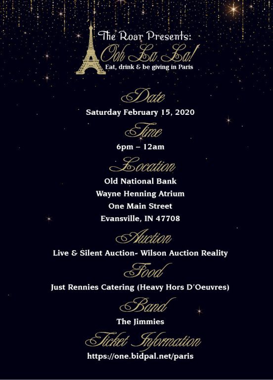 The 2020 Roar will be held on Saturday February 15, 2020 at 6:00 PM in the Wayne Henning Atrium of Old National Bank in Downtown Evansville.
